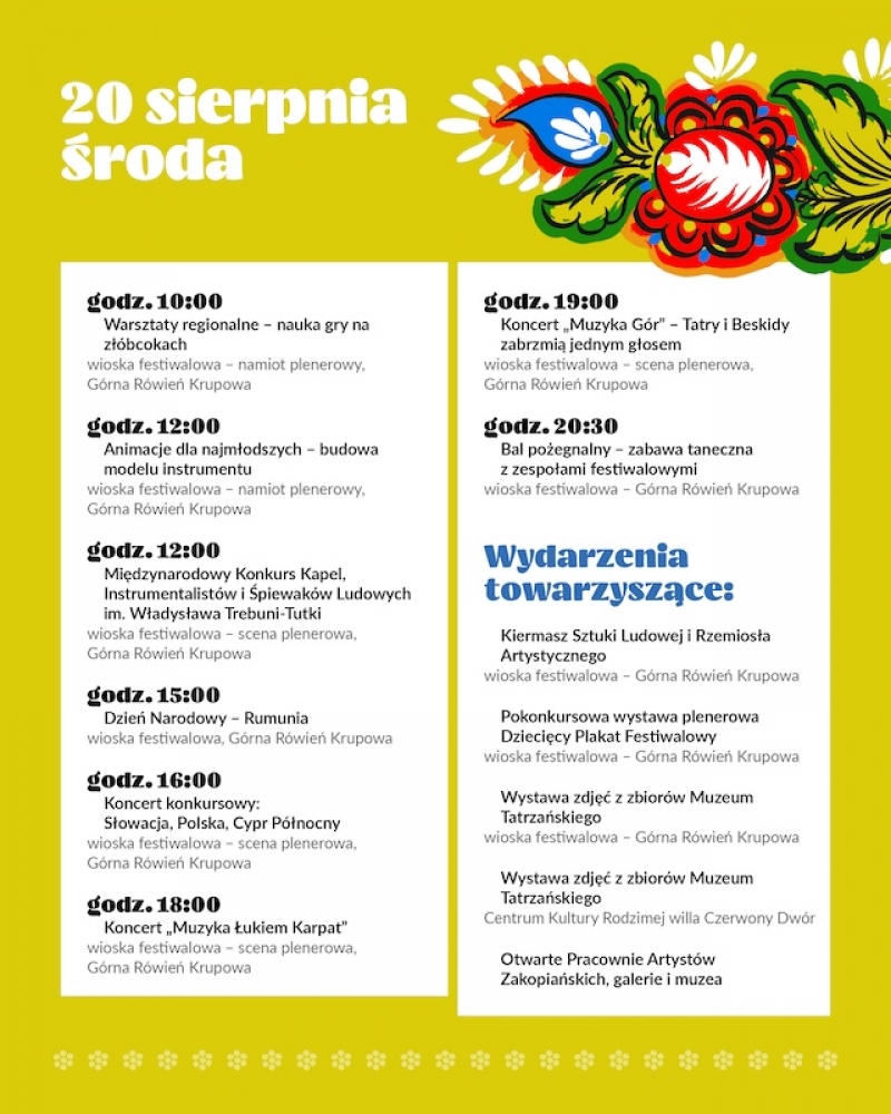 Wieczorem Zakopane roztańczyło się w rytm greckiej muzyki. Publiczność nie tylko oglądała występ zespołu, ale także sama włączyła się do wspólnego tańca. Uzupełnieniem artystycznych wrażeń była degustacja tradycyjnych potraw, która przeniosła uczestników wprost nad Morze Egejskie.