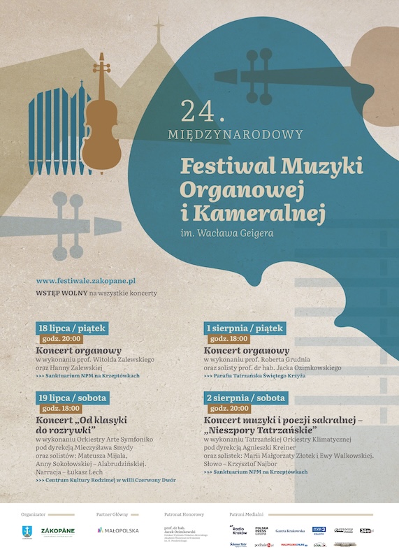 W tegorocznym programie znalazły się cztery wieczorne koncerty, które odbędą się w wyjątkowych przestrzeniach Zakopanego. Inauguracja festiwalu nastąpi 18 lipca w Sanktuarium Matki Bożej Fatimskiej na Krzeptówkach, gdzie wystąpi znakomity duet rodzinny: prof. Witold Zalewski - organista wawelski, oraz jego córka Hanna Zalewska - również organistka. W ich interpretacjach usłyszymy utwory m.in. J.S. Bacha i F. Mendelssohna - muzykę głęboką, wpisującą się w sakralny charakter miejsca.
