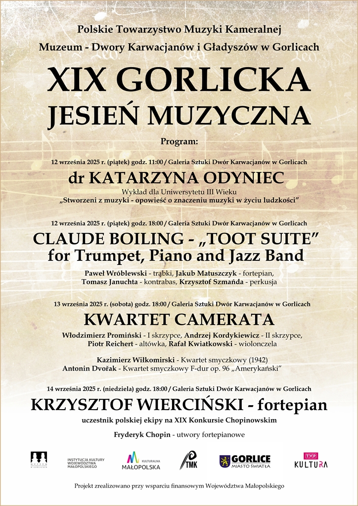 Polskie Towarzystwo Muzyki Kameralnej i Muzeum - Dwory Karwacjanów i Gładyszów w Gorlicach zapraszają na XIX Gorlicką Jesień Muzyczną12 września 2025 r. (piątek) / godz. 11:00 / Galeria Sztuki Dwór Karwacjanów w Gorlicach