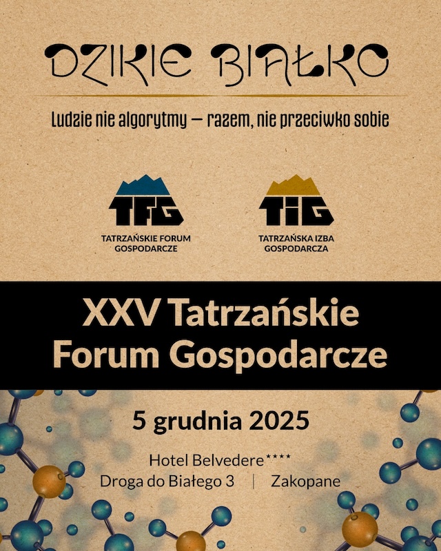 Już 5 grudnia w Zakopanem odbędzie się wyjątkowe, jubileuszowe XXV Tatrzańskie Forum Gospodarcze. Wydarzenie, które od lat integruje środowisko biznesowe, samorządowe i społeczne Podhala, w tym roku odbędzie się pod hasłem "Dzikie białko - ludzie, nie algorytmy. Razem, nie przeciwko sobie".Poniżej pełny program wydarzenia.