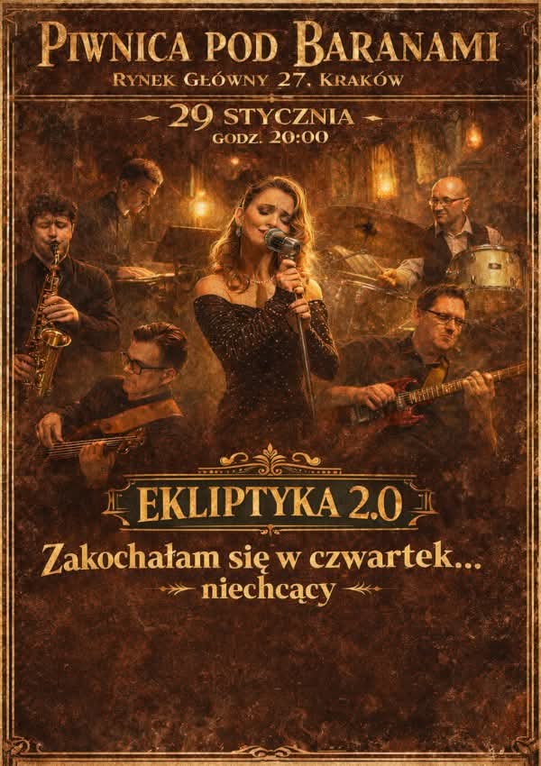 EKLIPTYKA 2.0 zaprasza na wyjątkowy wieczór muzyczny w legendarnej Piwnicy pod Baranami – miejscu, gdzie historia Krakowa spotyka się z artystyczną duszą jazzu.Koncert „Zakochałam się w czwartek… niechcący” to nastrojowa podróż do świata słynnych polskich szlagierów sprzed lat, odczytanych na nowo w jazzowych aranżacjach. Znane melodie zyskują tu świeże brzmienie, swing, improwizację i elegancki, klubowy klimat rodem z lat 20. i 30. XX wieku.