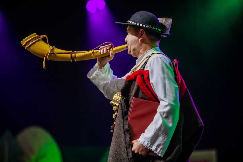 Róg. Krzysztof Trebunia-Tutka rozpoczyna drugi dzień narodowy. I piosenka, że nigdzie nie ma takiej muzyki, jak góralska, choćbyś obszedł cały świat.