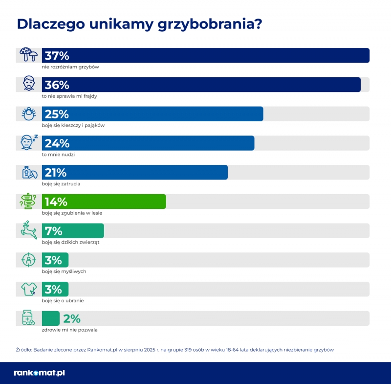 Mimo to 21 proc. przeciwników grzybobrania mówi wprost, że obawia się zatrucia, a 37 proc. podświadomie unika grzybów z obawy przed ich nierozróżnianiem. Inne lękowe powody to strach przed pająkami i kleszczami (25 proc.), zgubienie się w lesie (14 proc.), napotkanie dzikiej zwierzyny (7 proc.), postrzelenie przez myśliwych (3 proc.) i wreszcie ryzyko pobrudzenia czy zniszczenia odzieży (3 proc.).