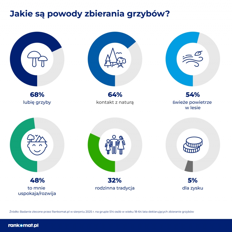 Dla 48 proc. zbieraczy grzybów powodem jest też możliwość uspokojenia się i rozwoju, 32 proc. podtrzymuje rodzinną tradycję, a zaledwie 5 proc. bierze udział w grzybobraniu dla zarobku.