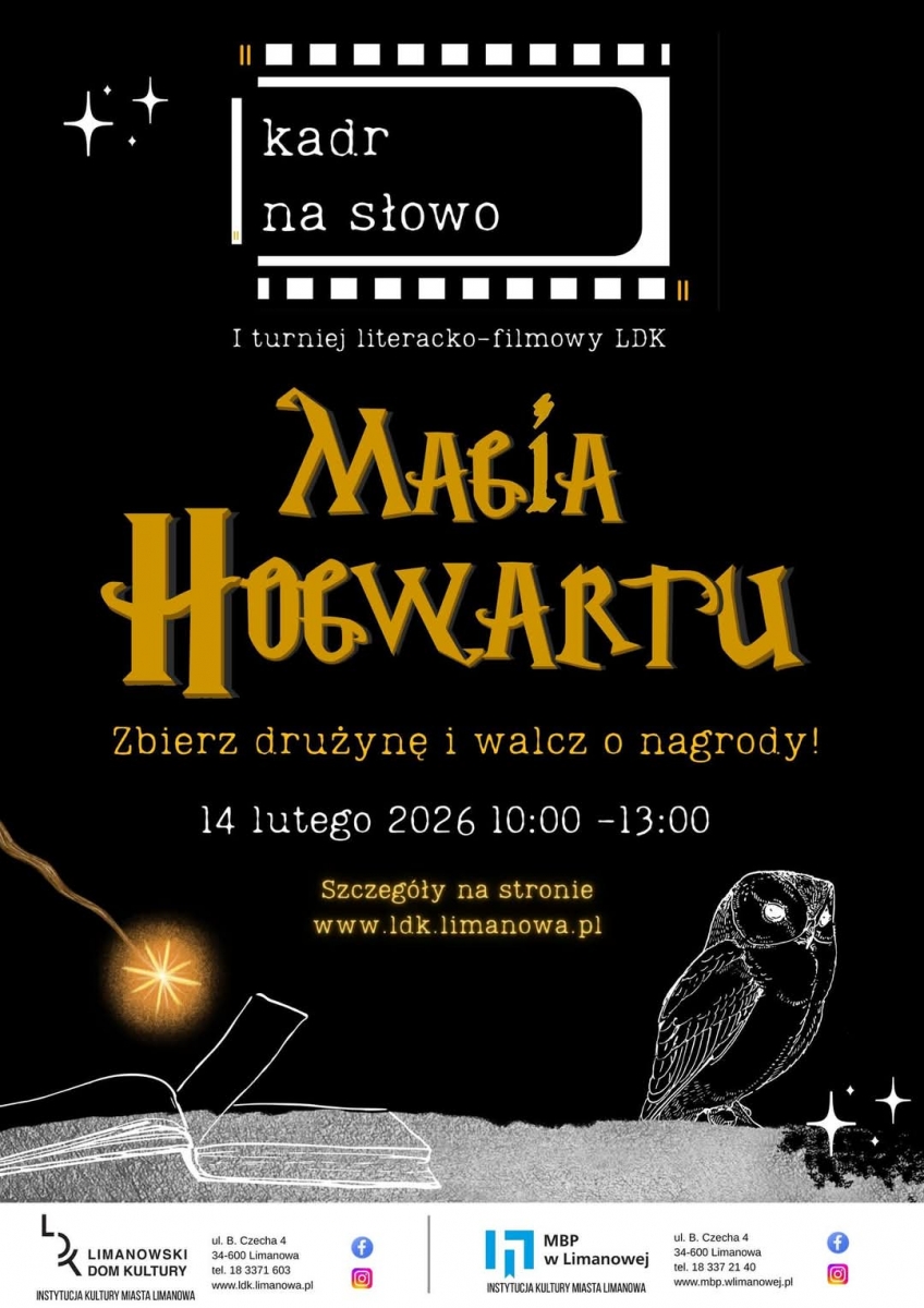 Limanowski Dom Kultury oraz Miejska Biblioteka w Limanowej informują o zmianie terminu I Turnieju Literacko-Filmowego LDK „Kadr na słowo – Magia Hogwartu”Do rywalizacji zapraszamy trzyosobowe drużyny międzypokoleniowe (8–12 lat, 13–17 lat oraz 18+ – kapitan), które zmierzą się w czterech konkurencjach: