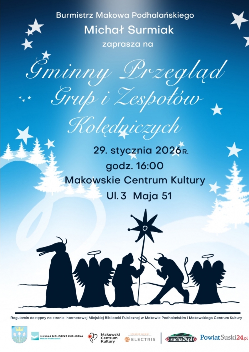 Burmistrz Makowa Podhalańskiego, Pan Michał Surmiak, serdecznie zaprasza na Gminny Przegląd Grup i Zespołów Kolędniczych.Makowskie Centrum Kultury (Sala Widowiskowa)