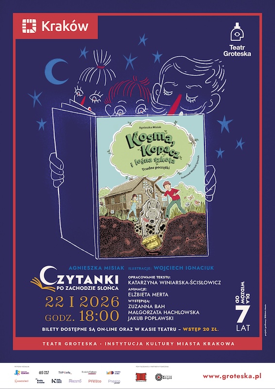 „Czytanki po zachodzie słońca” to cykliczne spotkania realizowane przez Teatr Groteska we współpracy z Fundacją Burza Mózgów i Festiwalem Literatury dla Dzieci w Krakowie.