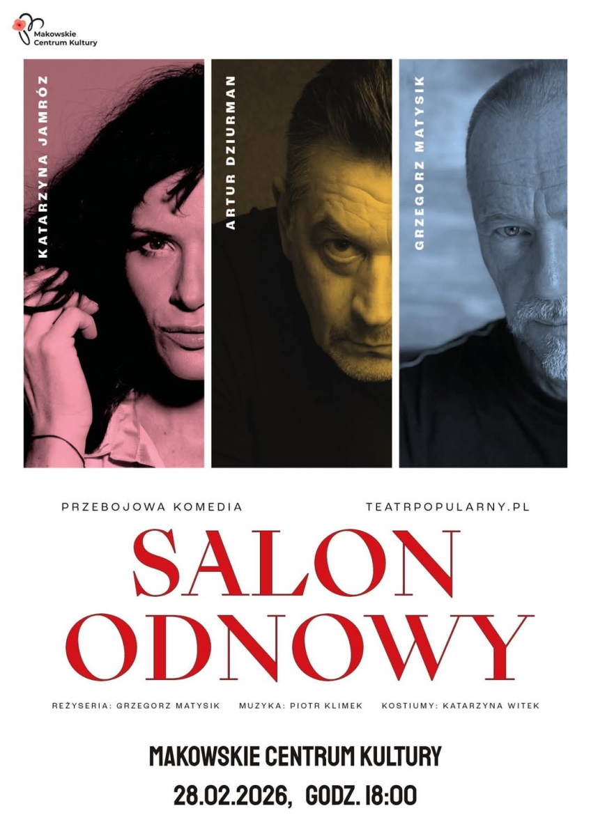 Makowskie Centrum Kultury zaprasza na spektakl Salon OdnowyDwóch niezadowolonych z życia mężczyzn, w dojrzałym wieku, trafia do SALONU ODNOWY, prowadzonego przez tajemniczą, piękną kobietę, której życie również nie rozpieszczało. Za pomocą różnych zabiegów próbuje ona przywrócić obu panom wiarę w sens życia. Odnowa duchowa, której są poddawani, odkrywa przed nimi nieznane światy i prowadzi do zaskakującego finału.