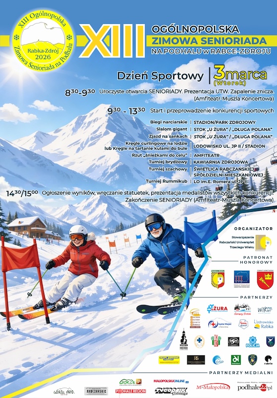 W dniach 2-3 marca 2026 roku Rabka-Zdrój stanie się miejscem ogólnopolskiego spotkania aktywnych seniorów.W XIII Ogólnopolskiej Zimowej Senioriadzie na Podhalu weźmie udział ponad 400 zawodników z całej Polski, którym kibicować będzie blisko 250 widzów. W programie znajdą się m.in. slalom narciarski, biegi, szachy, brydż, nordic walking, a także konkurencje rekreacyjne i imprezy towarzyszące. Wydarzenie połączy sportową rywalizację z integracją i dobrą zabawą w zimowej scenerii Rabki-Zdroju.